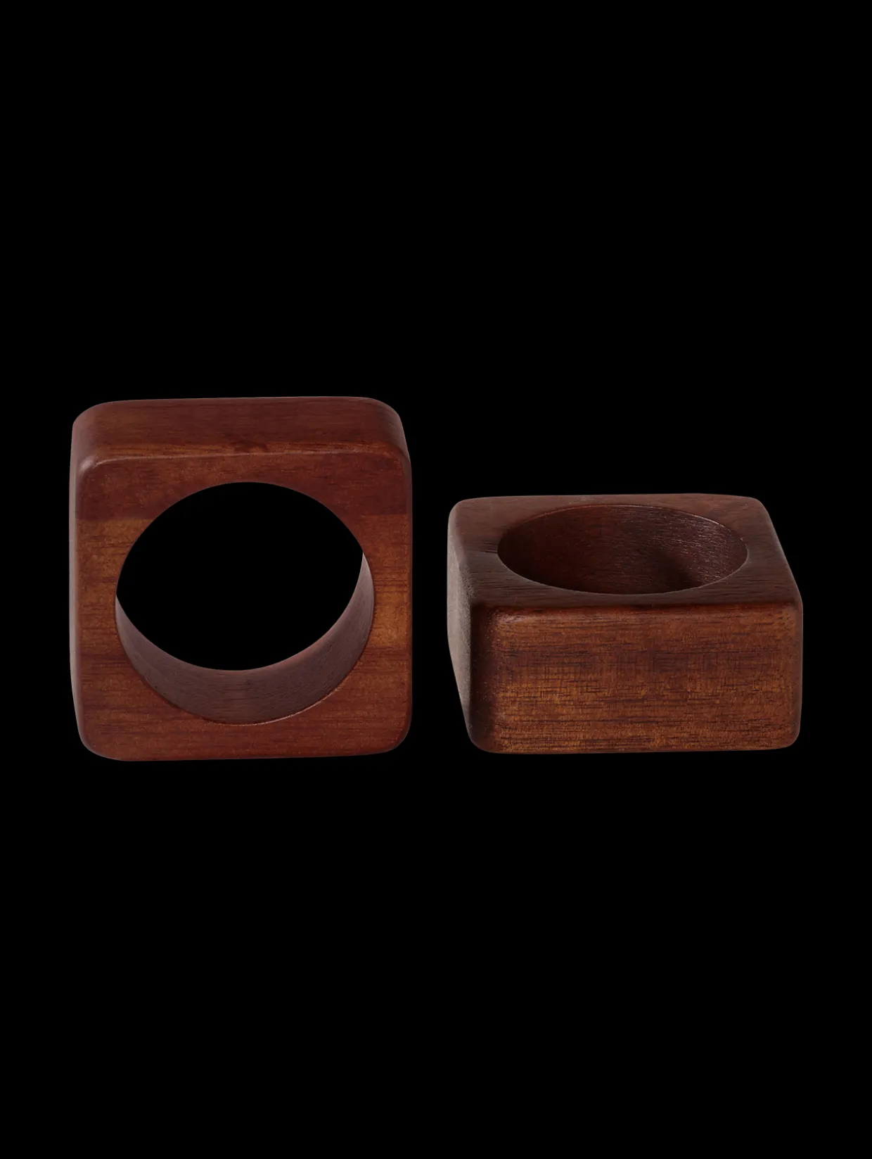 Quadratische Serviettenringe mit glatter Oberfläche, die aus massivem Akazienholz gefertigt sind. Mit ihrer individuellen Maserung sind sie Hingucker und zugleich echte Handschmeichler.